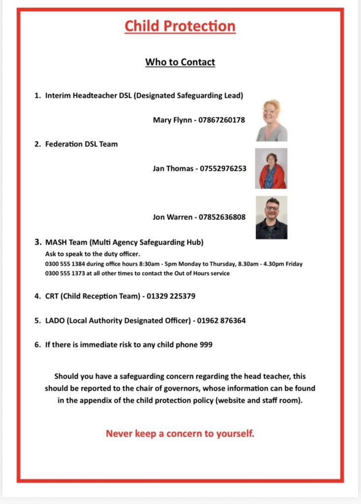 If you have a concern regarding a child’s safety or welfare please speak to one of our safeguarding leads.